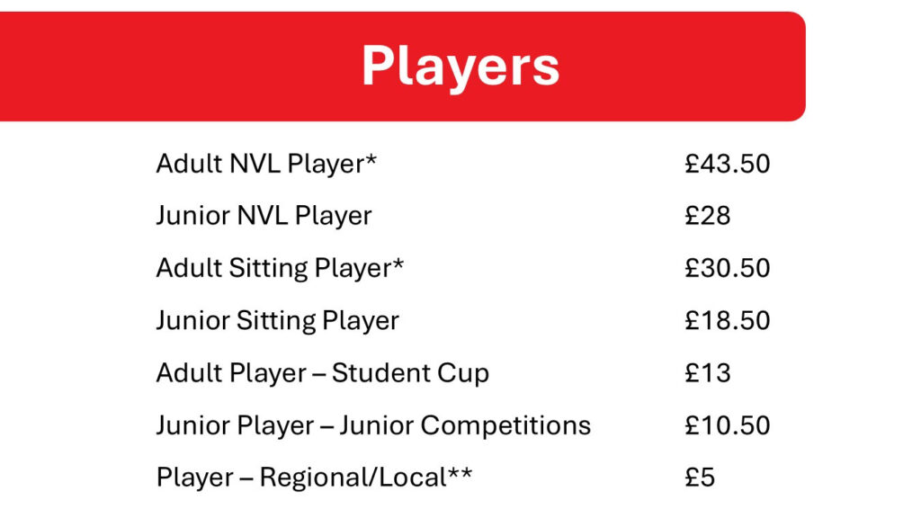 **This category is only for players who wish to participate in the Cup & Shield but do not hold any other active VE player membership for the season. Adult or junior players taking part in regional or local leagues will have a separate category set up by their respective Region or County.